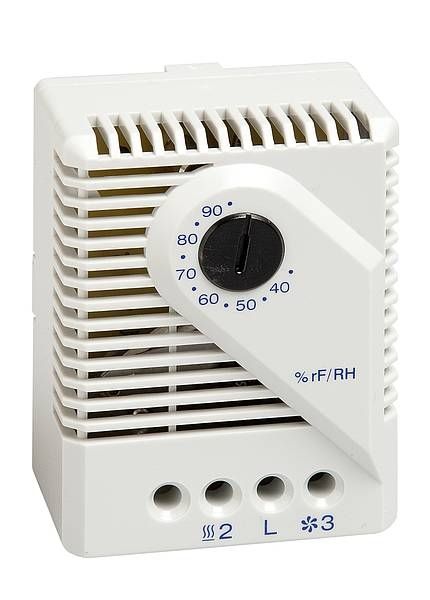 Higrostat electromecanic utilizat in special pentru comanda ventilatoarelor / elementelor de incalzire cu scopul evitarii condensului, respectiv coroziunii componentelor electronice instalate in panouri electrice.