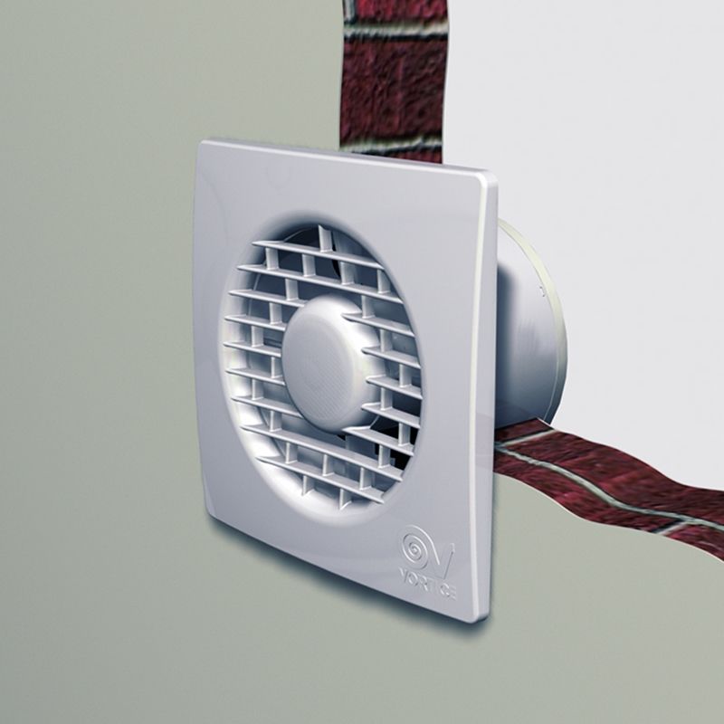 Ventilator axial pentru evacuarea aerului direct in exterior, utilizat in spatii rezidentiale.