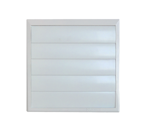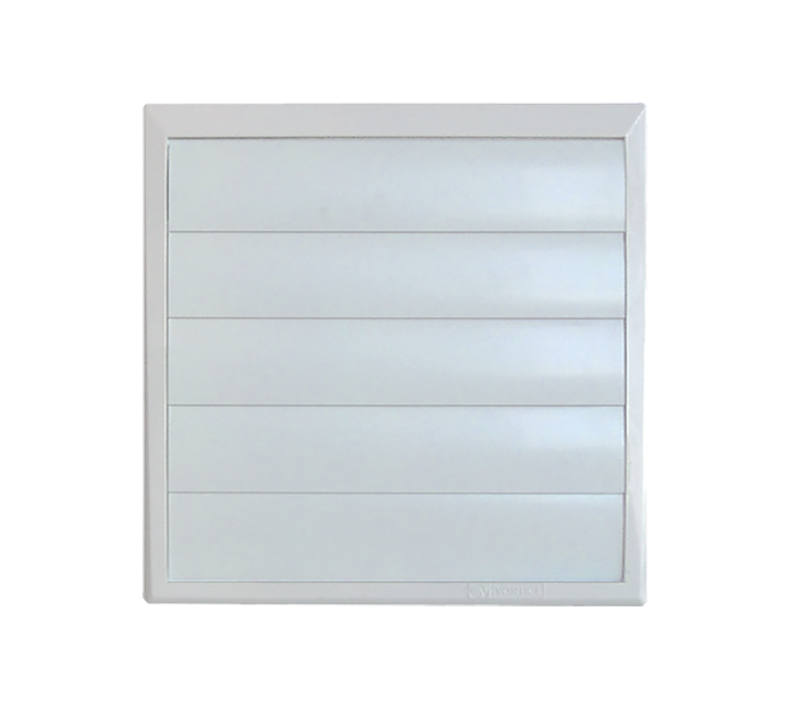 Grila gravitationala patrata cu lamele din plastic, montaj aplicat pe perete exterior.