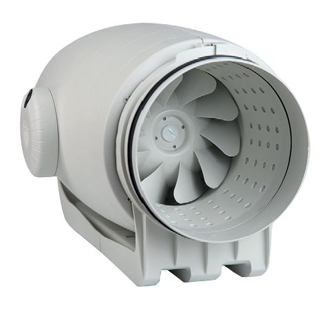 Ventilator axial silentios, montaj in-line, pentru evacuarea aerului prin tubulatura de ventilatie din spatii comerciale.