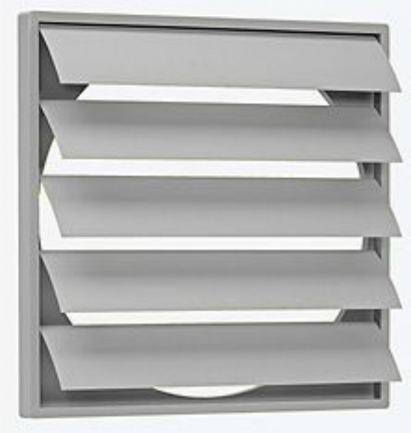 Grila gravitationala patrata cu lamele din plastic, montaj aplicat sau incastrat pe perete exterior.