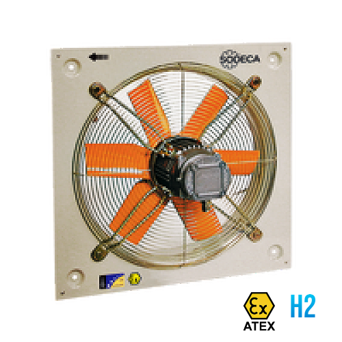 Seria HCDF/ATEX - Ventilatoare axiale antiex de perete cu motoare ExII2G Ex-db pentru functionare in incinte cu pericol de explozie, protectie ATEX IIB+H2 T4 pentru medii cu degajari de hidrogen.