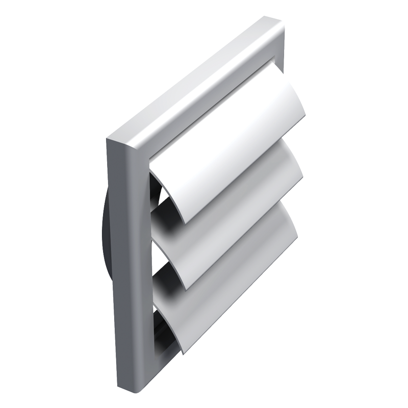 Grila gravitationala patrata cu lamele din plastic, montaj aplicat sau incastrat pe perete exterior.