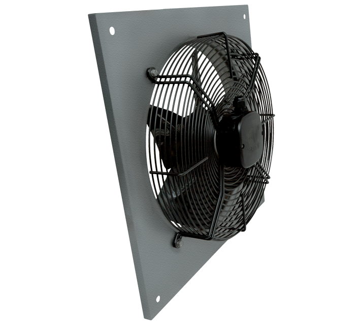 Ventilatoarele sunt antrenate de un motor asincron cu protectie termica, grad de protectie IP54, clasa de izolare I, rotor montat pe rulmenti cu bile, elice din otel cu acoperire poliesterica de culoare neagra, grilaj de protectie.